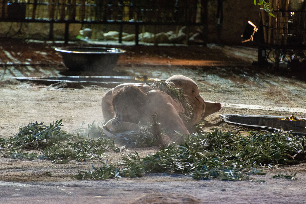 ψωμί και κρέας· ο οινοχόος να τραβά απ’ τον κρατήρα
