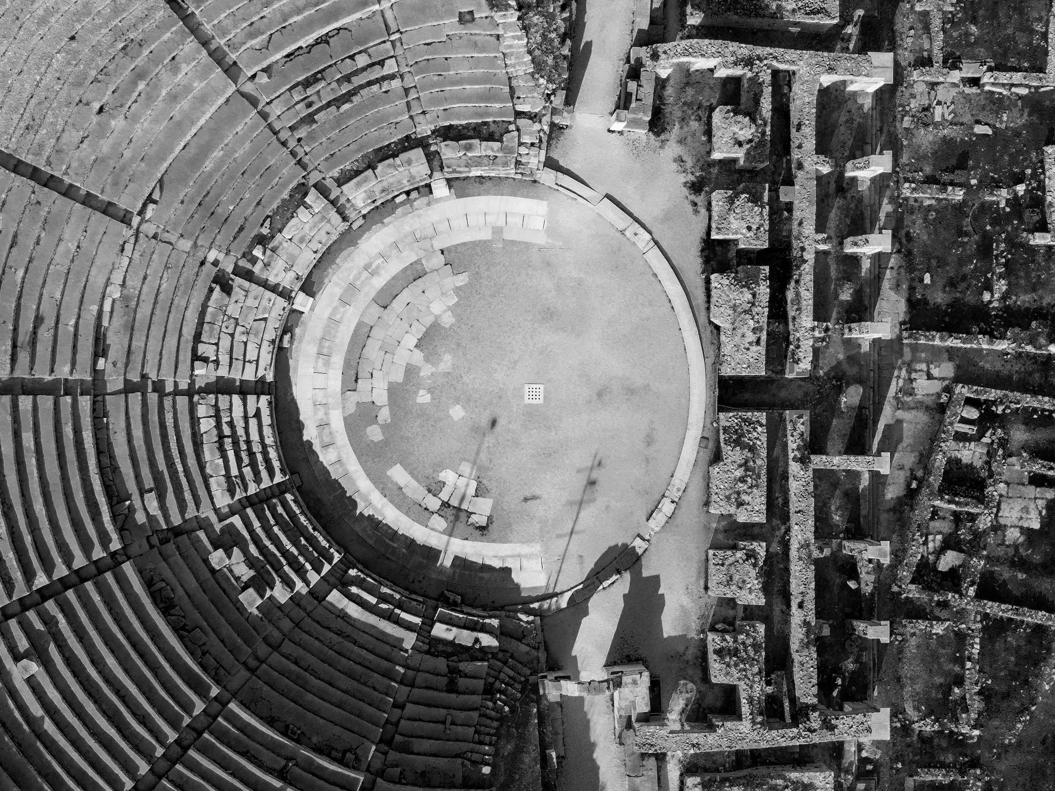 Νότια της σκηνής υπήρχε πλακόστρωτη πλατεία, η οποία κατά τους Παλαιοχριστιανικούς Χρόνους καλύφθηκε από νεότερα κτίσματα.